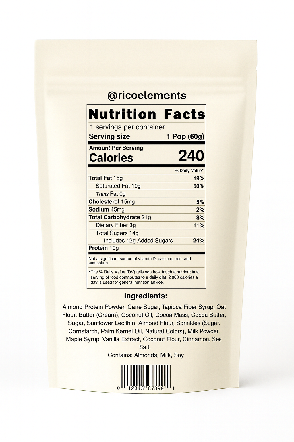 Almond Protein, Cane Sugar, Oat Flour, Almond Flour, Coconut Oil, Butter (Cream), Tapioca Fiber Syrup, Cocoa Mass, Cocoa Butter, Sunflower Lecithin, Vanilla, Milk Powder, Coconut Flour, Sea Salt.